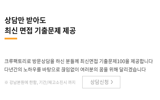 크루팩토리 상담을 받고 함께 고민을 들어주시고 방법을 제안해주신 쌤과 함께 해주시겠다는 선생님 말씀 덕분에 남들보다 내가 더 열심히 해야겠구나 정말 꼭 하고싶다라는 생각이 들었고 각오 할 수 있었습니다!?특히