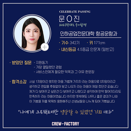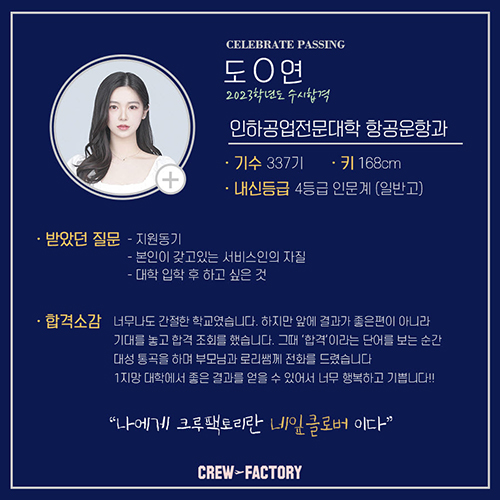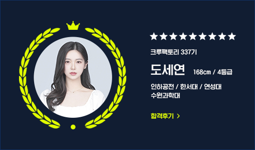 승무원 학원을 알아보면서 저는 총 다섯 군데나..!?상담을 다녔었습니다.?다섯 군데에 다녀본 저의 최종 결론은?'크루팩토리 못따라간다...'?였어요!?어느 학원보다도 입시에 대한 정보나,?자신감이 엄청나다는