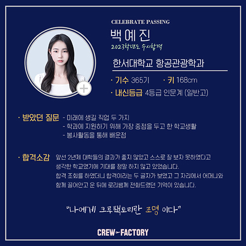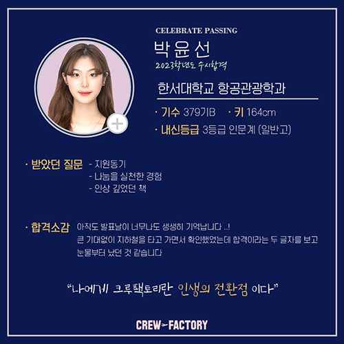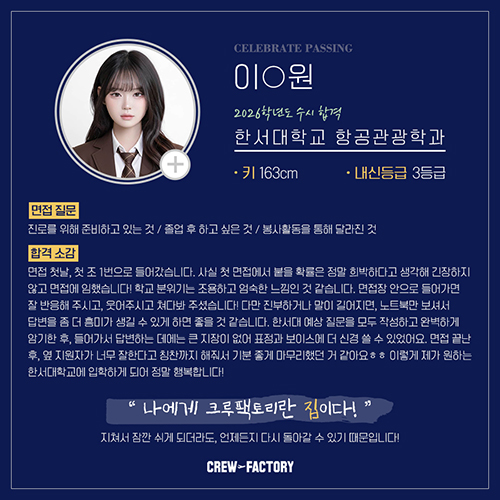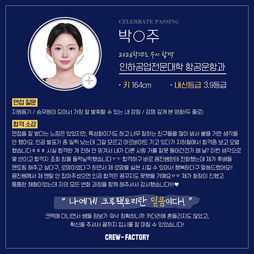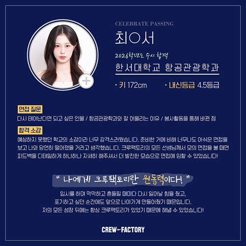 제가 어느 항공과 대학을 갈 수 있는지도 친절히 알려주시고,?크루팩토리가 항공과 학생들을 가장 많이 배출해서 정말 많은 항공과 입시정보들을 알고 계세용! ?최신정보들을 바로바로 알려주시거든욧?ㅎㅎㅎ 크루팩토리